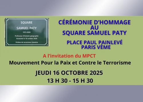 Date de publication : 09 octobre 2024. Le 16 octobre 2024, une cérémonie avec dépôt de gerbes aura lieu à Paris, au Square Samuel Paty, Place Paul Painlevé, dans le 15e, de 14 h 30 à 16 h 30, avec la ...